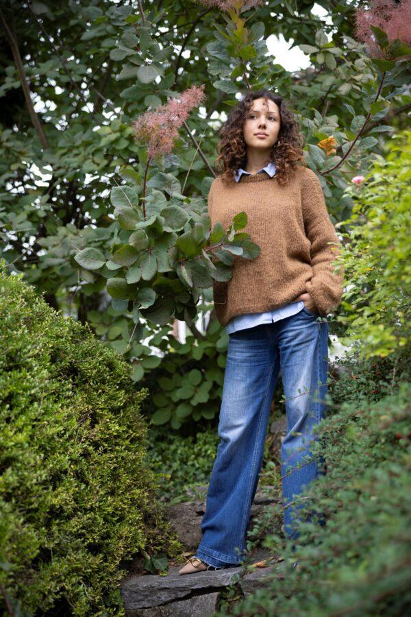 Moderne und lässig bequeme flared – Jeans im Style der 70er- zum Saum hin weit verlaufendes Bein mit offener Saumkante und seitlichen Einschubtaschen. Waschung mediumblue.